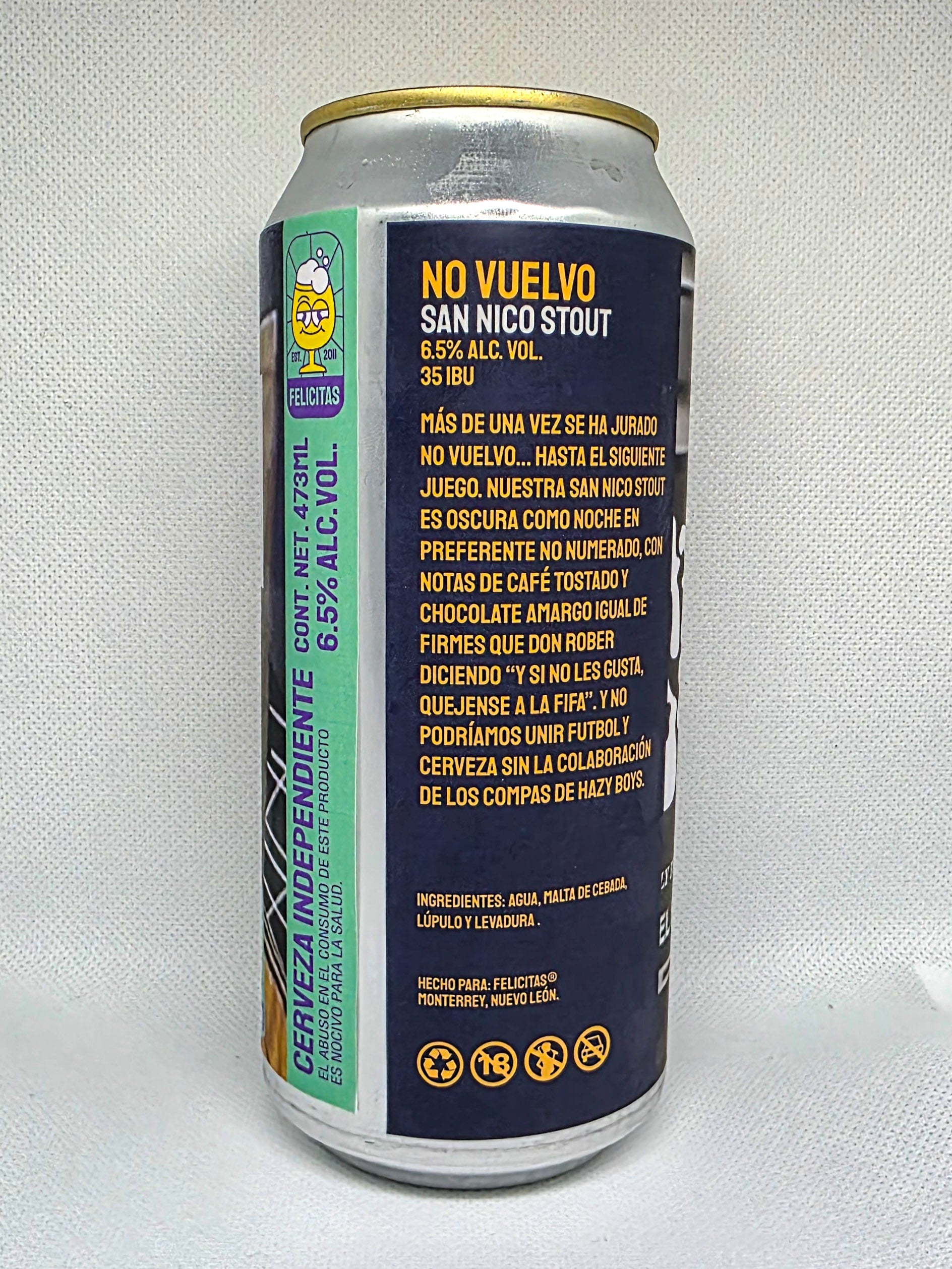 Nuestra San Nico Stout es un estilo que, inspirado en el municipio, es oscura y robusta, con carácter (como la ex de Lupillo, que era de San Nico). Tiene notas a café negro, chocolate amargo y ese rostizado seco que entra firme por la banda. Agresivamente bebible.